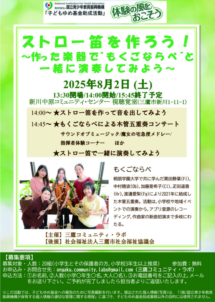新川中原コミュニティ・センター視聴覚室にて、木管五重奏で『ストロー笛を作ろう!~作った楽器で“もくごならべ”と一緒に演奏してみよう~』に出演しました